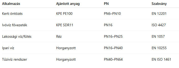 - PN16 – ivóvíz fővezetékek és közmű rendszerek