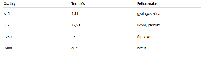 Általában legalább B125 vagy nagyobb terhelési osztály, nagyobb forgalomnál D400 ajánlott.